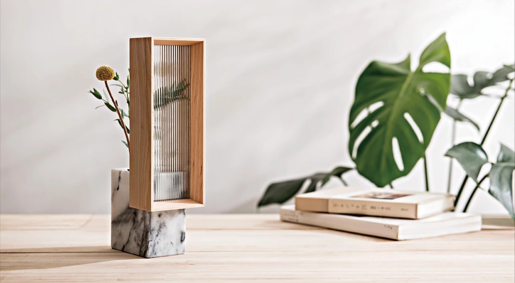 3+2 Design 設計的「桌上窗景」 Table Window 花器,使用了大理石作為基座花器,並崁入具有傳統風格的玻璃木窗框,透過不同的壓花紋理,背後的植物和景色會呈現若影若現的不同風貌,造就了獨特的美感。
