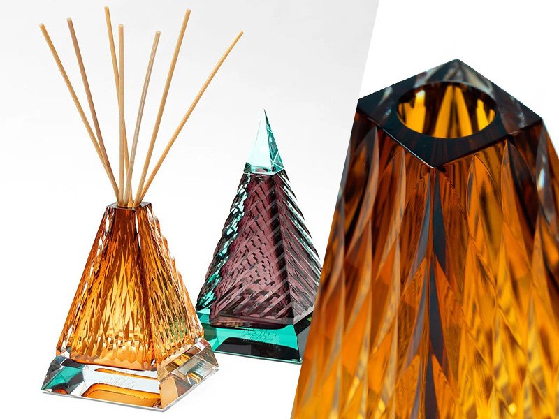 擴香瓶長 13 公分、寬 13 公分、高 17 公分,每個擴香瓶都是由 moser 師傅吹製、手工切割而成,展現傳統工藝與現代設計的合作。